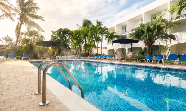 Personnel accueillant à la réception. L'hotel est très bien située à 1 min de la plage , mais pas en bordure de plage. L'état général de l'endroit est plutôt vieillot mais tout de même bien entretenu. Les chambres sont de bonne dimension avec balcon. Le nôtre donnaitbsur la rue. Le système de climatisation ainsi que l'eau chaude fonctionnent parfaitement. Nous avions un lit king très confortable plutôt ferme. Il n'y avait qu'un drap pour nous couvrir. La cour intérieure est bien aménagée. La piscine est propre et il y avait plusieurs chaises à notre disposition. Nous y avons aperçu une famille de singes. L'hotel est à proximité de la plage Dover, qui est très bien. Des locaux vous louent des chaises pour environ 15Bds. Vous trouverez des restaurants, marchés, souvenirs, jaraoke, live bands et clubs à distance de marche, en plus de taxis en face de l'hotel pour vos déplacements. Nous n'avons pas pris de déjeuner à l'hôtel mais le rum punch qu'ils servent est le meilleur que j'ai goûté!