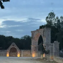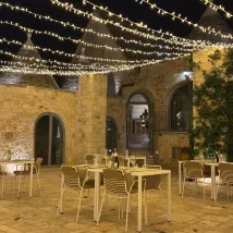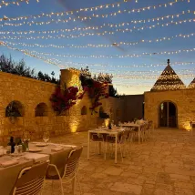 Abbiamo prenotato alla Masseria Grieco per una cena al loro ristorante, siamo rimasti piacevolmente sorpresi dalla location. Un ristorante caratterizzato dalla presenza di vari trulli e di una cascata di luci mozzafiato. Abbiamo ordinato un piatto masseria con ceci e tria, e una guancia di vitello brasata al primitivo. Nel complesso i piatti erano sufficienti, purtroppo nel piatto masseria era presente una grande quantità di formaggio che non era segnalato nel menu. Dolci ottimi, servizio non sempre attento, abbiamo dovuto chiedere olio e sale che erano già presenti in tutte le altre tavole. Offerta a fine pasto di liquori di loro produzione molto apprezzati. Esperienza nel complesso positiva nonostante i prezzi leggermente alti. Si paga la location spettacolare e non il piatto ma esperienza consigliata.