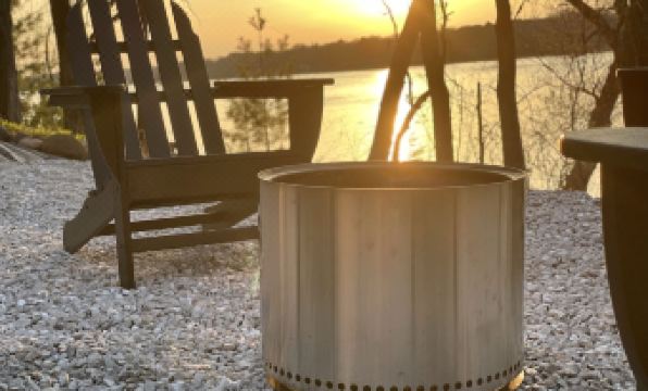 A firepit features a SoloStove Bonfire and Adirondack chairs to help enjoy the night sky filled with stars.