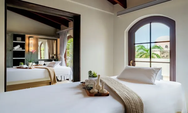 We stayed in the French wing and had a lovely view of the courtyard. The room itself was beautifully styled, though on the smaller side. One thing to note: the bed that was advertised as a king turned out to be a queen, and there really wasn’t much space to move around it—you had to be careful not to bump into things.
