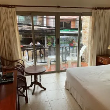Nice staff, rooms large enough with good air con, good hot shower, enough shampoo and shower gel and coffee and tea making facilities. The hotel is dated but is situated in a good area for bars and restaurants. Maid service is daily and nice towels are provided with water each day. The pool area is nice but small with limited sunbeds, limited shade and no towels or umbrellas. There are chairs in the shade for the pool view rooms only. The restaurant is popular and does well and there seems to be a lot of returning custom here. Beds are a little hard and so are the pillows in the Thai style. We had a room overlooking the road 3rd floor but did not find it noisy. There are no safes in the room but there are some in reception. We would certainly consider staying here again but because it is in Patong the price seems a little high compared to other properties we have stayed in.