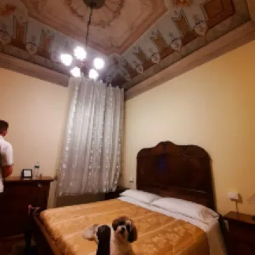 Nous avons séjourné 3 nuits dans cette demeure historique à 5 minutes à pieds de la tour de Pise., donc idéalement située à un prix très intéressant de 300€ avec les pts déjeuners, taxes et le parking. Nous avions choisi ce B&B car nous avons un petit chien, ce qui a été idéal car le jardin est grand et bien clôturé. La réception est ouverte de 8h à 12h , comme nous sommes arrivés en fin d après-midi, nous avions le code d entrée de la porte principale, ce qui nous a permis de récupérer les clés de la chambre laissée sur la porte et d aller ouvrir le portail. Une très bonne communication sur booking pour tous renseignements. Nous avions pris une chambre avec salle de bain COMMUNE, qui en fait est une salle de bain réservée à notre chambre mais à l opposée du couloir. Ce n était pas embêtant car en cette hors période scolaire il n y avait pas beaucoup de monde dans cet établissement. Bon le lieu est en effet un peu vétusté mais très propre et il est tout à fait dans son authentique charme d époque, c est une affaire de goût mais vue l établissement historique c est une décoration en adéquation avec son époque je dirais. Je regrette juste le petit déjeuner qui manque de choix et de raffinement, c est un peu tristounet comme présentation.