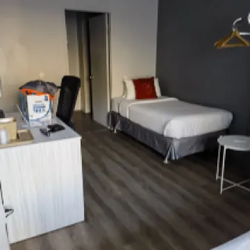 入住這家飯店需要行動能力。飯店沒有電梯,所以你得把行李從停車場搬到四層樓高的房間。停車免費,但飯店有一個小型游泳池。