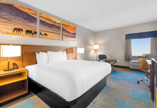 Breakfast was very disappointing. They whole area was not cleaned. I was first person there and I had to remind them it was time to turn on the lights. The sink was dirty, waffle iron looked like it had been used, no orange or apple juice in machine, they said they were out. Microwave had somewhat f looked like flour around the base. It looked like the food had been placed in there last night and left till morning. Coffee machine/ coffee did not taste like coffee. Bed was comfortable, bathroom was clean. Staff looked like they lived there carrying the baby around on their hip, they did not try to show any empathy with the winter storm issue. I left a Day early so as not to get stuck in the city, they would not give me any kind of discount for the day, no empathy. My door was unsafe, as if someone had busted through.