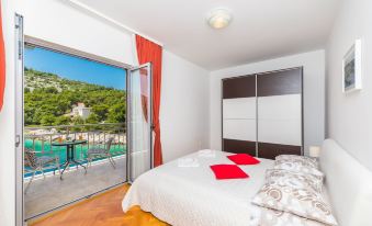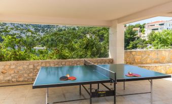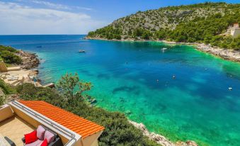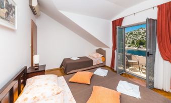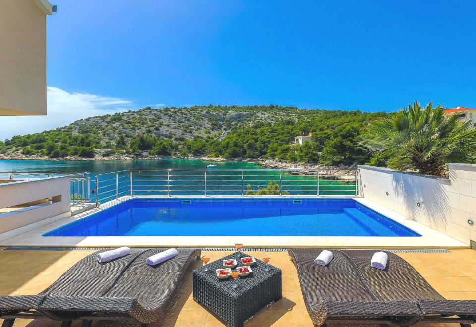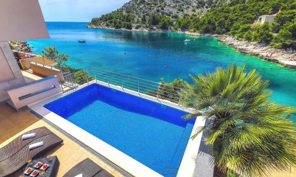 Ražanj 10 km from Rogoznica: Beautiful single-family house "Villa Silvana", 3 storeys. In a quiet, sunny position, at the seaside, on the beach, direct access to the beach. Private: property 300 m2 (fenced), terraced garden, swimming pool angular, heated (8 x 3 m, depth 100 - 180 cm, seasonal availability: 01.Jan. - 31.Dec.). Barbecue. In the house: internet access. Roofed, parking at the house on the premises. Shop, restaurant 500 m, bus stop 6.1 km, rocky beach 10 m. 5-room house 180 m2 on 3 levels, south facing position. Tasteful and cosy furnishings: living room with satellite TV (flat screen), air conditioning. Exit to the terrace. Dining room. Open kitchen (4 hot plates, oven, dishwasher). Sep. WC. Upper floor: 2 rooms, each room with 1 double bed (2 x 80 cm, length 200 cm). Exit to the terrace. 1 room with 2 beds (90 cm, length 200 cm). Exit to the terrace. Bath/WC. Top floor: 1 room, ceiling height 120 - 370 cm with 1 bed (90 cm, length 190 cm). Exit to the balcony. Shower/WC. Balcony 2 m2, terrace 40 m2, roofed, 2 terraces 10 m2. Terrace furniture. Marvellous view of the sea. Facilities: washing machine, baby cot. Internet (WiFi, free). Parking (roofed, 3 cars). Please note: private mooring.