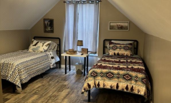 This cabin is 1/2 of a spacious duplex that sleeps 4 comfortably with a queen bed and full bath on the first level and 2 twin beds with a 1/2 bath upstairs. There is plenty of room to add an air mattress if needed.