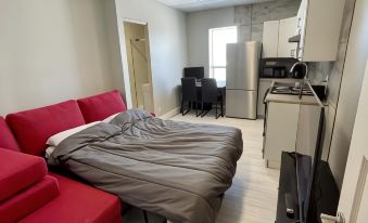 C'était visiblement un appartement en rénovation, à moitié fini. Il y avait une belle cuisine et des choses luxueuses (même trop), et d'autres qui n'avaient pas d'allure (papier de toilette qui traine par terre, fils électrique apparents autour du cadre de porte pas fini, pas super pour les enfants, chambre sans aucune fenêtre ou aération, bain à remous brisé et au contour non fini....). On s'en serait acommodé, mais le problème était la saleté Poils et cheveux dans le bain, etc, plancher rempli de poils, cheveux et de traces - on a du changer nos bas dans l'auto avant de partir parce qu'il étaient trop sales. La literie était très propre, mais la tête de lit si poussiéreuse et sale qu'on a dormi la tête de l'autre côté. Bien dommage, car la localisation était parfaite, la cuisine bien garnie, et le prix, bien intéressant.
