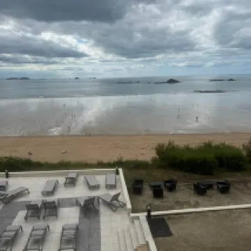 Emplacement idéal au bord de l'océan. Appartement tout confort, le plus dans la salle de bain : la baignoire et une pièce de douche séparée. Grande piscine dont nous avons pu profiter jusqu'au jour du départ. Accueil excellent. La seule amélioration à apporter serait d'avoir dans la chambre un lit double au lieu de 2 lits simples. Saint-Malo est une ville magnifique Bref, nous retournerons dans cet établissement avec grand plaisir.