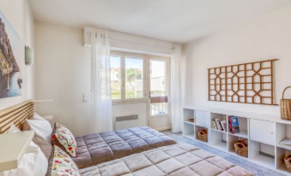 Apartment block "Les Mimosas", 4 storeys. In the resort 20 m from the centre of Sainte Maxime, in a central, sunny position, 100 m from the sea, 200 m from the beach. In the house: lift. Grocery 50 m, pedestrian zone 100 m, 2 minute walk to the centre, bus stop 40 m, railway station "TGV St Raphaël" 17 km, sandy beach 200 m, diving center 150 m, thermal baths "Thalassothérapie Les Issambres" 7 km. Sports harbour 100 m, golf course (18 hole) 3 km, tennis 1.5 km. Nearby attractions: Aqualand Waterpark 3 km, St Tropez Ramatuelle 17 km, Port Grimaud 6 km, Gorges du Verdon 80 km, Navette / shuttle boat St-Tropez 15min 100 m. Hiking paths: Massif des Maures 7 km, Massif de l'Esterel 20 km. Please note: the keys‘ handover takes place by the agency Interhome in Sainte Maxime. Airfield 60 km from the property. 2-room apartment 54 m2 on 2nd floor, south facing position. Object suitable for 2 adults + 2 children. Spacious and bright, comfortable and beautiful furnishings: living/dining room with 1 double sofabed (1 x 140 cm, length 190 cm), TV. Exit to the terrace. 1 room with 2 beds (90 cm, length 190 cm). Open kitchen (oven, dishwasher, 4 ceramic glass hob hotplates, toaster, kettle, microwave, freezer, electric coffee machine). Bathroom, sep. WC. Electric heating. Balcony 6 m2, south facing position. Balcony furniture. View of the sea and the port. Facilities: washing machine, iron. Internet (WiFi, free). Parking. Please note: non-smokers only. Maximum 1 pet/ dog allowed. Smoke alarm. 83115003465MX