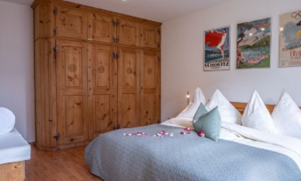 Samedan: Apartment house "Chesa Muntarütsch", 4 storeys. On the outskirts, on a slope, located by a road. For shared use: garden (not fenced), natural garden. Terrace. In the house: storage room for bicycles, storage room for skis, washing machine (extra), tumble dryer (for shared use, extra), drying room. Single garage. Supermarket 1.2 km, shopping centre 1.9 km, restaurant 800 m, bakery 650 m, bus stop 300 m, railway station 900 m, indoor swimming pool 8.8 km. Golf course (18 hole) 1.7 km, tennis 1.8 km, riding stable 7 km, walking paths from the house, cycle lane 100 m, mountain railway 4 km, chair lift 1.2 km, slopes 4 km, ski rental 900 m, ski school 4 km, cross country ski track 500 m. Well-known ski regions can easily be reached: Corviglia - Marguns - Celerina 4 km, Corvatsch - Furtschellas - Surlej 14 km, Diavolezza - Lagalb - Pontresina 18 km. Well-known lakes can easily be reached: Lej da Staz 9 km, St. Moritz See 8 km, Silvaplana See 13 km. Hiking paths: Corviglia - Piz Nair, Muottas Muragl, Val Bever. Please note: railway line closeby 30 m from the property. "Chesa Muntarütsch", 2-room apartment 55 m2 on 2nd floor. Cosy and wooden furniture furnishings: living/dining room with 1 sofabed (140 cm, length 190 cm), dining table and TV (flat screen). Exit to the balcony. 1 large double bedroom with 1 double bed (2 x 90 cm, length 200 cm). Exit to the balcony. Kitchen (oven, dishwasher, 4 ceramic glass hob hotplates, toaster, kettle, electric coffee machine, Capsules for coffee machine (Nespresso) extra, fondue Set (cheese)). Bath/WC. Heating. Wooden floors. Balcony furniture. View of the mountains, the countryside and the resort. Facilities: iron, hair dryer. Internet (WiFi, free). Garage space n 2, height 193 cm, width 230 cm. Please note: non-smokers only, non-smoking house. Maximum 2 pets/ dogs allowed.