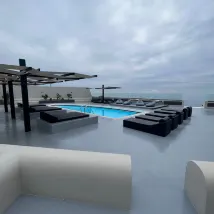 We were disappointed for a variety of reasons. Firstly, it is east facing so you can't see any of the caldera, sunsets or white vusta that Santorini is famous for. Fira is 1.5km away and a taxi charges €45 for a family of 4 so we spent more on taxis in Santorini than a month in Europe. The room was OK for cleanliness but the kitchen... yikes. The cutlery was not washed at all. It was covered in food, finger prints and general grossness. There were no spoons or bowls, no wine glasses, and no way of preparing a simple sandwich in your own room for lunch. Breakfast was OK but came very late on the day we had requested it early. It was inconsistent in quality and the orange juice is just cordial. The coffee is stone cold. We chose abrazzo because the Amnos villa slept 7 and we could get 2 cots, making 9 in total which was our group. It had space which was good. (The shower is so small you can't shave your legs... you have to open the door and reverse your butt out to get your leg up. This hotel is not recommended for anyone on the larger side otherwise no shower for you.) The service was terrible. There was no loo paper after day 2 so we had to source our own. All in all, I'd never stay here again and would not recommend to anyone. Photo is of sunrise as there is no view west.
