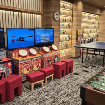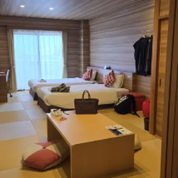 地點個人覺得算方便了,離車站約10多分鐘走路路程。大廳 mini bar 供應許多咖啡飲料還有點心,住客可以無限拿取享用,還有許多書及雜誌,可在休息區享用,甚至帶回房間也沒關係。冰淇淋也有,還有生啤酒 high ball,晚上還有一段時間有供應下酒菜,一樣可以拿回房間,當然每個人都是適量取用,沒有不足的情況,只是通常已吃完晚餐,溫泉旅館的晚餐基本上都很浮誇,而且一樣有一堆酒可以喝到飽,所以吃太飽就沒有再去拿 mini bar 了。館內設施超多玩不完,桌球、遊戲機、還有小朋友遊戲區,所以住客有很多親子。秉持溫泉旅館特色,他們鼓勵你可穿著浴衣跟拖鞋在館內活動,浴衣花色也好看。我最喜歡的部分是按摩椅有約6台,完全不用排隊,預設時間是15分鐘,但因為真的沒客滿過,我洗完溫泉後直接躺了30分鐘直到晚餐時間。唯一叫美中不足的是,房間海景view,可能因為我住2樓,而且被分配到別館,view沒有覺得很厲害,但海還是很美的。房間一樣又大又舒適,還有投影設備可以看 YouTube 跟 Netflix 。總體評價是高的,寫評論的同時已開始懷念想再回去入住🤣