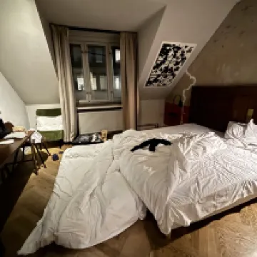 酒店的兩個單人床的房間應該很少,入住時被告知衹有1樓的。有個酒吧營業到很晚有點吵,所以衹能要了上面的一個雙人床的房間,結果打地鋪睡,腰都斷了。天花板有斜坡有點壓抑,房間比較小