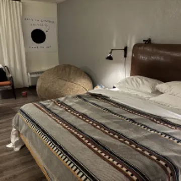房間佈置很藝術化,很特別,但是沒有冰箱,也可以說什麼都沒有,沒有拖鞋,牙膏、牙刷,沒有咖啡包,當然更沒有咖啡機。也沒有水壺或水,但樓下有💦,喝水要去樓下喝,據前台服務員說,因為只有他一個人,所以也蠻同情他。酒店靠近ASU 所以一切就將就點吧!