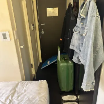 地理位置很方便,成田機場一趟車過來不用換車。地鐵茅場町1號或者3號出來走三分鐘以內,茅場町地鐵站有淺草線、副都心線、東西線,去淺草、銀座、築地市場超近,新宿 澀谷差不多半小時多。樓下就是羅森,附近711和全家也都有,附近松屋 ガスト すき家 燒肉店都很近。但是雙人房真的很小,衹能在門口攤開一個26寸的箱子,出門還得合起來,幸好沒帶兩個28,好在床是一米四的 睡起來也比較舒服。