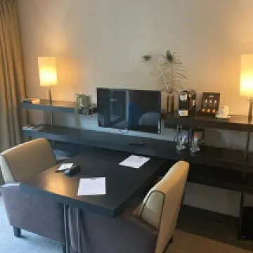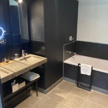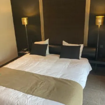 Helaas wist ik niet dat het hele hotel zwart is! Zwarte tegels op de vloer zwart toilet, zwarte badkamer! Het geheel kwam op mij heel deprimeerend over! Geen enkele kleur dan alleen bruin! Een les om me beter te orienteren! Maar ik dacht een vrij nieuw hotel! De sommelier deed geen enkele poging om te vragen of wij een drankje (wijntje) wilde bij het gerecht! Als je geen wijnarrengement neemt tel je niet mee! Al met al één grote teleurstelling!!