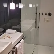 這家飯店位於維拉弗蘭卡德爾佩內德斯 (Vilafranca del Penedès) 的中心地帶,其設計和裝潢令人嘆為觀止。飯店坐落在一棟保留了原貌的老建築內,室內裝潢現代時尚,採用精心設計的裝飾和高品質的材料。深色木材和深紅色窗簾佔據了主導地位,在某些地方,例如樓上的走廊,營造出一種略顯陰鬱的氛圍。浴室配有超大淋浴間和非常現代化的衛浴設施。床很舒服,還配有空調。燈光系統過於複雜,難以理解。電視(順便說一下,是 Loewe 品牌)位於床的一側,位置不太舒服。走廊的地毯需要翻新。早餐在宜人的玻璃餐廳供應。並非自助餐,僅包含咖啡和果汁(非天然果汁)、吐司和糕點。飯店內不設停車位,但飯店正前方有一個公共停車場(配備電動車充電樁),提前預訂的停車費為每天 23 歐元。簡而言之,這是一次獨特的酒店體驗,也是探索比拉弗蘭卡德爾佩內德斯的良好基地。