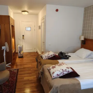 酒店在老城區,位置好,除了來回機場需要打車,其他基本都能步行到達。整體設計比較復古,有生活感。內部設施有露天花園和bar,可惜我們住的那天天氣不好,沒有機會體驗到。公共區域有很多洗手間,非常乾淨方便,這點特別好!健身房在比較深的地方,器械齊全。除了北歐標配的桑拿房外,還有一間休息室可以熨燙衣服,以及一間獨立會鎖門的行李寄存間。住的房間空間大,空氣流動性好,家居比較舊但乾淨整潔,是我們這麼多天休息得最好的一晚!酒店工作人員從前台姐姐吧枱小哥到餐廳服務員和房間清潔都很親切,任何問題都會耐心幫忙。早餐也不錯,橙汁是鮮榨的,用餐環境很好。不得不説,這家酒店是我們這趟旅行中不是最貴但住得最舒適,全員滿意度最高的酒店了。 ps 翻遍了手機發現竟然沒怎麼拍酒店,光顧着體驗了,衹有一張在酒店等電梯的時候覺得綠植擺設和背景很好看,隨手拍的角落圖