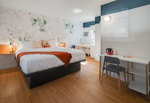It’s a cute little motel with some simple design updates to the room. Could do with an extra chair and a small credenza to set your stuff.