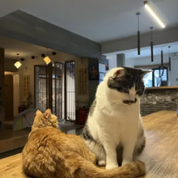服務非常棒——入住前一天,工作人員就非常熱情周到。我們晚上11點多才辦理入住,當時前台已經快要關門了,所以他們透過聊天軟體指導我們如何進入房間。工作人員會說英語。房間裡有兩張大雙人床、一次性拖鞋和盥洗用品。房間乾淨整潔,像是新裝潢的。飯店也提供免費飲用水。貓咪們也很乖巧。我們只住了一晚,所以沒能完全體驗酒店的氛圍,但我們睡得很好,而且之後還有時間去探索這座城市。如果再來西安,我們一定會再次選擇這家飯店。非常感謝你們提供的優質服務!