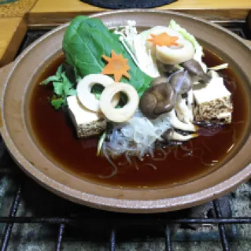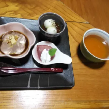 お風呂と温泉がユニークな旅館です。 明治8年に建てられたと言う宿の旧館には、半地下の源泉がありました。 1300年の歴史を持つ無色透明なお湯は、28.2度の冷泉です。霊泉とも言えます。 まず冷泉を加温した熱湯で身体を温め、バスタオルを身体に巻き、階段を何段か降りて、半地下の冷泉の風呂に入ります。ここに「湯権現様」が祀られているパワースポットです。 これを繰り返すとの事ですが、正直冬には行ったり来たりが少し厳しいです。 しかし、内風呂の中にも、熱湯と冷泉の2つの湯船があり、こちらを利用して何回か「熱い冷たい」を繰り返しました。 すると、風呂から出た後、ずっとポカポカしていました。 旧館のお風呂のみ、日帰り湯をやっています (旧館のお風呂は月曜日は休館日)。 翌朝、新館(旅館客室がある方)のお風呂に行きました。 露天風呂と内湯があり、こちらには冷泉風呂は無いです。 露天風呂は比較的ぬる湯だったので、ゆっくり浸かりました。 露天風呂と内風呂の窓からも今が見頃の濃いピンクのサザンカが満開でとてもキレイでした。 お風呂には洗顔石鹸やオイルもあります。 キレイな脱衣場と洗面エリアには化粧水などがありました。 部屋はキレイな8畳の和室と広縁でした。コーヒーマシンも部屋にありました。 部屋からの景色は富士山も含めた山々が遠くに見えます。朝気がついたのですが、葡萄畑も住宅地の中に広がってました。 ロビーでは、15時から17時に、ウエルカムワインが置かれていて、白ワインをいただきました。朝食後にはコーヒーサービスもあります。 食事の素材やワインは、全て地元に根付いたものとの事です。地元の旬の食材を一品一品丁寧に仕上げた「甲州会席」と、若女将が厳選した山梨ワインとのマリアージュをご堪能くださいとの事なので、お酒は山梨ワインを頼みました。 山梨ワインは、白はボトル2800円から、また赤は3300円からです。山梨ワインのみを提供することは、山梨ワインのプロモーションにもなるし、自産自消で良い事と思います。 甲州市のワイナリーのキザンワイン赤を初めての頼んでみした。 スパイシーで酸味も効いていて、日本食に合いました。ワインの葡萄はブラッククィーンです。山梨でブラッククィーンのワインはあまり無いかも。 お作りの刺し身こんにゃくは美味しく、焼き物の鰆のこうじ焼きは美味でした。 メインの鍋物のすき焼きは肉が大きかったです。 朝食は熱々宝刀(ほうとう)で、身体が温まりました。バランスの良い和食膳でした。 館内とても清潔でキレイで、快適でした。 いろいろな面で気配りかあって、温かい接客の、ホスピタリティが素晴らしいお宿と思いました。 また温泉猫の温泉の入り方や館内紹介などのイラストが、ほっこりとまた、ユニークです。