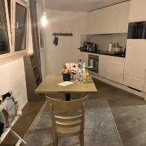 Als wir das Appartement betraten, waren wir als erstes begeistert vom eleganten Design und der fantastischen Aussicht auf das Matterhorn. Auf den zweiten Blick kam uns dann der Gedanke an Schneewittchen und die sieben Zwerge. Nur hatte es nicht sieben Gäbelein, sieben Löffelchen und sieben Messerlein, sondern jeweils genau vier. Das zweite Schlafzimmerchen mit dem Kajütenbett ist übrigens so winzig, dass dort die Zwerge ihre Zipfelmützen und das Mäntelchen besser schon vor der Türe ausziehen, weil es drinnen zu eng wird. Dort hätten wir lieber eine Dusche gehabt – im geräumigen Bad hat es eine Wanne mit einer die halbe Seite abdeckenden Glasscheibe. Da schaffe ich es doch immer wieder den Raum unter Wasser zu setzen und der Ein- und Ausstieg ist stets eine sportliche Herausforderung. Nun aber genug geschnödet. Die Wohnung ist wirklich eine Wucht, ein grosser gedeckter, wind- und wettergeschützter Sitzplatz mit einem hübschen Designertisch, bei dem man allerdings etwas aufpassen muss, dass das Besteck nicht zwischen den Metallsprossen hindurch fällt, da wären Tischsets praktisch. Eine riesige, sonnige Gartenterrasse mit viel Privatsphäre, zwei Sonnenschirmen und drei Liegen. Geräumige Wohnküche mit lichtdurchflutetem Salon und hübschen Möbeln. Alles farblich perfekt abgestimmt. Die Küche ist übrigens neben der knapp bemessenen Anzahl Besteck und Gläser erstaunlich gut ausgestattet, Nesspresso-Kaffeemaschine, erstklassige Geschirrspülmaschine, Induktionsherd mit 4 Platten, effiziente Ablufthaube, Superbackofen mit Steamer, Mikrowelle, riesiger Kühlschrank, Pfannen und was in manchen Ferienwohnungen ein Mangel ist, hier sogar mit passenden Deckeln, Racletteofen, Fonduerechaud. Ein Paradies für den ambitionierten Hobbykoch. Sogar ein Rezeptbuch mit dem Titel «Richtig gut kochen mit maximal 6 Zutaten». Ich blätterte ein bisschen darin, die ersten paar Seiten hatten allerdings Zutaten, die im Juli in Zermatt kaum erhältlich sind, grüne Spargeln zum Beispiel oder Thüringer Mett, was immer das auch ist, vielleicht findet man sowas beim Tierfuttergestell im Supermarkt. Aber, wie gesagt, die Wohnung ist märchenhaft, Im geräumigen Schlafzimmer ein wirklich bequemes Doppelbett mit angenehmer Bettwäsche, genügend Schränke. Es hat uns ausgesprochen gut gefallen und wenn wir wieder nach Zermatt reisen, buchen wir gerne wieder dieses Appartement, falls die uns nochmals reinlassen, nachdem ich hier im Tripadvisoretwas geschnödet habe und am letzten Abend eines der vier Gläser im Geschirrspüler in Brüche ging, weil ich es zu eng hineinstopfte.