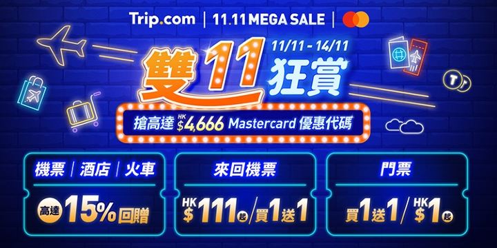 Trip.com一連四日推出萬眾期待的雙11狂賞優惠,由11月11日起至11月14日,每日定時發放各種優惠,包括機票及酒店優惠高達HK$1,111、預訂機票、酒店及高鐵可享高達15% Trip Coins回贈、限量一口價來回連稅機票HK$111起及買一送一優惠、以及交通、門票及體驗限時快閃優惠等。優惠數量有限,萬勿錯過! 限量機票及酒店優惠代碼,以Mastercard預訂滿HK$2,000即減HK$1,111 由11月11日至14日活動期間,每日凌晨12時發放機票或酒店優惠代碼,以Mastercard預訂機票或酒店滿HK$2,000即減 HK$1,111,或滿HK$1,000即減 HK$500!11月11日更有優惠加碼,中午12時將加推酒店優惠代碼,以Mastercard預訂酒店滿HK$1,000即減 HK$500! 機票優惠代碼亦會加碼!由11月11日至14日活動期間,每日晚上9時正將推出指定目的地機票優惠代碼,以Mastercard 預訂由香港或澳門出發至以下目的地之航班,滿HK$500即減 HK$111!另外亦有商務艙優惠代碼同時發放,11月11日及12日晚上9時正開搶,預訂商務艙機票滿HK$4,888即減HK$888,名額每日33個,立即為您的旅程升級! 另外,World Mastercard信用卡優惠代碼亦會於11月11日凌晨12時開放使用,直至11月14日,預訂機票滿HK$3,000減 HK$200 / 滿HK$4,500 減 HK$300 優惠;預訂酒店滿HK$3,000 減 HK$200,名額有限,先用先得。 預訂機票、酒店及高鐵可享高達15% Trip Coins回贈 Trip.com於11月11日至14日活動期間推出限時Trip Coins回贈優惠,預訂機票、酒店及高鐵可享高達15% Trip Coins回贈。 Trip.com更推出限定Trip Coins加碼回贈,於11月11日至14日期間預訂香港或澳門出發來往指定目的地包括哈爾濱、名古屋、福岡、札幌及三亞的機票及當地酒店,可獲高達額外1,999 Trip Coins(約HK$156)! 限量一口價來回機票連稅HK$111起 由11月11日至14日活動期間,每日晚上9時正或9時30分準時開搶限量一口價來回連稅機票,包括香港來回東京、福岡、曼谷、墨爾本、台北、悉尼、上海以及成都航線,出發日期由當日至2026年2月28日,一口價價格由HK$111起,已包含所有稅項及附加費,每個目的地名額20個。 門票及體驗限時快閃優惠 由11月11日至14日活動期間推出限量優惠,每日中午12時準時開搶! 火車、旅行團、機場接送、郵輪及租車優惠 11月11日及14日每日凌晨12時開搶高鐵優惠券,買滿HK$74即減HK$73,名額100個;以及買滿HK$100即減HK$20,名額300個。 另外,由11月11日凌晨12時起開搶各類交通優惠券,包括旅行團及私人旅行團半價優惠券及9折優惠券、機場接送半價、7折以及92折優惠券、郵輪優惠券滿HK$6,999即減HK$299、海外郵輪優惠券滿HK$9,999即減HK$699、租車半價及92折優惠券。種類繁多,總能滿足您的需要! 以上各項優惠受條款及細則約束,有關詳情請參閱活動界面。