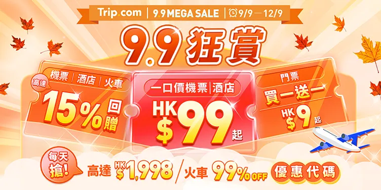 Trip.com一連四日推出狂賞優惠,由9月9日起至9月12日,每日定時發放各種優惠,包括機票及酒店優惠高達HK$1,998、預訂機票、酒店及高鐵可享高達15% Trip Coins回贈、限量一口價來回連稅機票HK$99起、限量一口價酒店優惠、門票及體驗限時快閃優惠等。優惠數量有限,Trip.com會員切勿錯過! 詳情請參閱Trip.com 9.9狂賞優惠活動頁面: https://hk.trip.com/sale/w/13505/2025-99megasale.html 機票及酒店優惠代碼,滿HK$1,500即減HK$999 由9月9日至12日活動期間,每日凌晨12時發放機票或酒店優惠代碼,預訂機票或酒店滿HK$1,500即減HK$999,或滿HK$1,000即減HK$599! 機票優惠代碼今次將會加碼!由9月9日至12日活動期間,每日晚上9時30分將推出指定目的地機票優惠代碼,預訂由香港或澳門出發至以下目的地之航班,滿HK$500即減HK$99! 另外,World Mastercard信用卡優惠代碼亦會於9月9日凌晨12時開放使用,直至9月12日,預訂機票滿HK$3,000減HK$200 /滿HK$4,500減HK$300優惠;預訂酒店滿HK$3,000減HK$200,名額有限,先用先得。預訂機票、酒店及高鐵可享高達15% Trip Coins回贈 Trip.com於9月9日至12日活動期間推出限時Trip Coins回贈優惠,預訂機票、酒店及高鐵可享高達15% Trip Coins回贈。 限量一口價來回機票連稅HK$99起 由9月9日至12日活動期間,每日晚上9時正準時開搶限量一口價來回連稅機票,包括香港來回台北、高雄、曼谷、大阪、札幌以及哈爾濱航線,出發日期由當日至12月31日,一口價價格由HK$99起,已包含所有稅項及附加費。 限量一口價酒店優惠 9月9日至12日活動期間每日中午12時正準時開搶一口價酒店優惠,以HK$99起預訂台北、泰國及中國內地的指定酒店。 高鐵限時優惠券、歐洲及英國火車優惠 由9月9日至11日活動期間,每日凌晨12時起開搶高鐵八折優惠券,折扣金額上限為HK$100,每日名額50個,以及高鐵HK$100減HK$15優惠券,每日名額200個。9月12日亦有高鐵HK$100減HK$15優惠券開搶,名額更高達600個! 另外,9月9日至12日活動期間亦有歐洲及英國火車半價優惠券,折扣金額上限為HK$109。9月12日亦有歐洲及英國火車4%即時優惠,能夠與其他優惠券同時使用。 門票及體驗限時快閃優惠 由9月9日至12日活動期間推出限量優惠,每日中午12時準時開搶! 另外,全球最大規模的室內滑雪場「深圳華發冰雪熱雪奇蹟」將於9月29日正式開業,門票將於9月13日進行預售,9月6日至12日期間Trip.com將發放獨家HK$42優惠券,記得預先領取優惠券,預售期間就能搶先以優惠價購買套票。 以上各項優惠受條款及細則約束,有關詳情請參閱活動界面