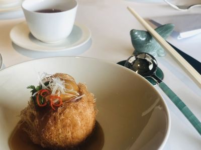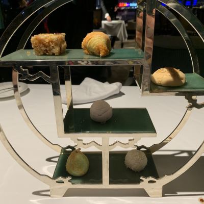 這家中餐廳位於尖東的洲際飯店地下層,是今年的米其林二星餐廳,有那樣的榮譽,就有那樣的服務和出品,這是必須要贊一下。餐廳是在飯店的負一層,從餐廳的側門出去,就是星光大道,外面也就是維多利亞港,白天的景色一班,晚上的話,由於燈光都開了,維港的夜景真是漂亮。餐廳的餐具擺設的材料主要採用的是玉石,從放在餐桌上面的盤子、筷子架、牙簽盒、餐巾扣,還是餐廳裡麵的屏風,裝飾品,都是選用玉石作為材料,更顯出它高貴的一面。 出品十分棒,例如:頭一道菜是鮑魚芋頭酥,是一個芋頭蓉做的酥角,芋頭很香,不會很甜,炸得火候控制得不錯,外脆內軟,最上面用了一片鮑魚當點綴,不是一整隻,只有切了厚厚的一片而已,整體賣相很好。又好像石鍋鱈魚,一位一位上的,一大塊鱈魚,事先炸過再放燒紅了的石鍋裡麵,鱈魚雖然炸過,但是它的內層還保持著鮮嫩,滑滑的魚肉很好吃,外層嘛,雖然被炸過,但是居然沒有吃出炸過的那一種苦澀味,只有脆脆的皮。核桃露,即使是一道簡單的糖水,也是做得那麼的出神入化,鮮磨的核桃露很香的核桃味,原汁原味,滿滿的一大碗,讓人驚喜的還是那個放在旁邊做裝飾的,手工捏製的象形核桃,很精緻,很細膩,是廚師手工一點一點地捏出來,所以吃起來感覺特別好吃。