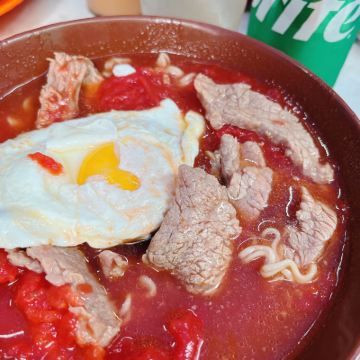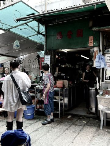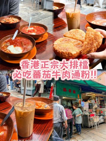 Leo-Greg冒着雨,從西營盤過來。轉悠了好幾個街巷,怎麼也沒想到要找的店是搭的這樣一個棚棚!原來路上碰到的幾個遊客也都是來這裏打卡的啊!落座。他家最有名的是番茄,點了碗番茄紅腸面,要了份奶油多士和奶茶。不停有人來邊吃邊拍照打卡。味道真是不錯。番茄醬據說是熬好幾個小時才出的味,濃郁。多士香脆。後來再次來這裏早餐,還想吃對面的九記牛腩,可惜遇到暴雨停業 ,他家的棚也收了,留下乾乾凈凈的空地。極好