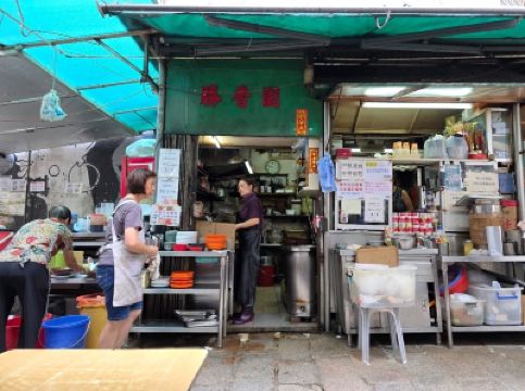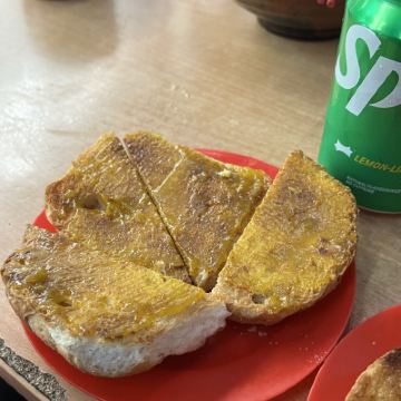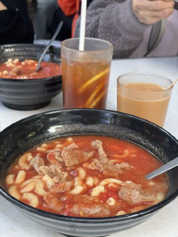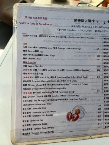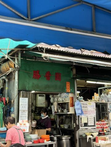 勝香園位於中環,是一家很簡單的大排檔形式的餐廳,在一條小巷子前面搭個鐵皮屋,放幾張桌子就開檔了,幸好店家在餐桌對上的地方都拉起了遮頭的雨篷,如果下小雨也不怕了。這裏經常需要等位,無論是當地人還是旅客,都同樣的多。我們來到這裏,沒有位置,就只能夠在路邊等位了,這裏的人都很乖,不需要拿等位號碼紙,直接排好隊站在等位的地方,一有位置,店家就會叫你過去。不要想着自己佔一張桌子,這裏的座位都是一個挨一個的,走兩個來兩個的,絕對沒有一個空位。 這裏出名的有番茄牛肉面/通粉和迦央,迦央就是東南亞的一種食物,用麵包或者吐司切開,塗上椰子醬,再烤香一下,出爐時麵包金黃色,酥脆可口,陣陣的椰子香味撲鼻而來,吃起來香香甜甜的,但是也不會很甜,我是挺喜歡吃這種食物的。 番茄牛肉面很暢銷,看到基本上每一位客人都會點,番茄牛肉是一大桶預先做好的,一個從地到腰那麼高的大桶,滿滿地裝滿了一大桶,有客人點的時候,店家煮好了麵條,就勺上一大勺倒下去,馬上就可以端給客人了,其實也真的很簡單,既然他們能夠弄那麼一大桶番茄牛肉,也就應該是店裡最好賣的東西了。看到店家們動作都很快,不一會兒就做好了,一會兒又送走一批客人,然後又迎來另外一批客人。