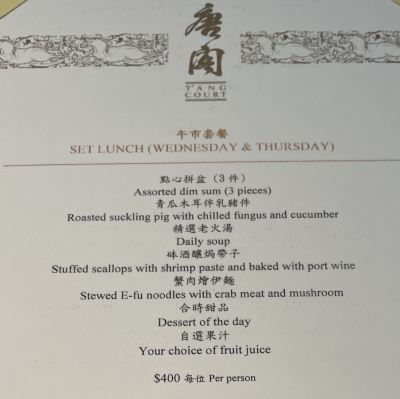 香港米其林唐閣的服務很好,坐的大廳服務也毫不遜色,所有侍應生細緻而周到,裝修比較簡約,但是乾淨整潔。主廚推薦的燒鵝皮厚多汁,但是溫度稍顯不足,其實盤子是加熱了的,但是冬季端出來肉還是涼了;蔥香和牛品質很好,口感嬌嫩,配上炸百合圈多了一些層次感;蟹皇花膠用料很足,蟹肉和蟹黃熬制的湯很濃,吃多了有點膩適合泡飯;例湯燉牛腩比較細膩;天鵝流沙酥品質確實是我至今吃過流沙裏面,最豐滿且細膩濃香;甜品燕窩芒果凍甜度合適,口感層次分明,兩顆星不失望。