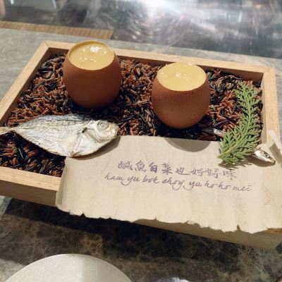 剛坐下時,便發現餐桌上的擺設就好像坐在海灘上,一隻可愛小龜背上長上了青苔,經侍應介紹下原來整隻小龜是可以吃的! 小海龜就好像我們吃的雞蛋仔的味道接着下來點好了菜后 ,侍應便 捧上了一大盆海膽和魚子醬 用來介紹給我們他將會用的食材。菜式一般都包含了東方和西方的元素就例如 ;海膽大蝦意粉 就包含了 中國 (芡汁 )日本 (海膽 牡丹蝦 )歐洲 (意大利粉 )的元素, 混合得來又不會有生硬 做作 的感覺。