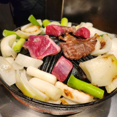 成吉思汗烤肉店,屬於可以隨便吃吃的韓國烤肉,比較粗放一點點,五花肉的味道還可以,上來先烤洋蔥提味,的確烤出來比較的香一點。