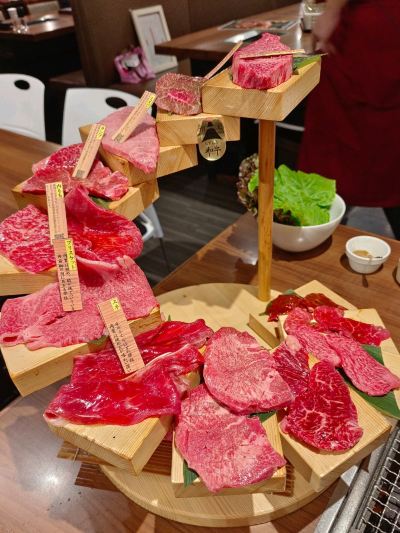 點了A5和牛拼盤,覺得油脂過多,私心還是偏愛牛肩肉的油花,覺得較為順口。推薦泡菜起司拌飯,搭配燒肉很美味。缺點是部分和牛上桌時已抹上烤醬,無法只吃原味,性價比高.一定要訂位,很滿客.