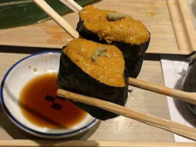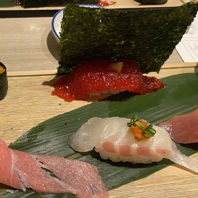 網上搜到這家網紅店,據說排隊幾小時,那天卻是運氣好,拿了號不到兩分鐘就給了一個吧台的位置:正合我心,師傅就在面前做給我看。 人氣很旺,本地人不少,也還有拖了行李箱來的,還有路過進來打包帶走的,還有吃完了再額外要一個什麼打包帶走的,說明它的品質的確是不錯的。 桌子上就有菜單,想好了就示意吧台里的師傅,他會停下來手裡的活,拿一個小機器給你點,然後壽司部分就是他來負責做,飲料和其它由服務員端過來。結帳的時候也是,管師傅要單子,再去門口結。這一個師傅管着面前的幾個位置,我們用餐的時候,是5組客人,工作效率也是杠杠的,頂倆。 動作很快,等我觀察完店裡,面前就來了一小盤壽司,碩大的魚生完全蓋住了下面的米飯,第一口選了一個金槍魚的,OMG,入口即化的魚片,勁道淡香的米飯,簡直太好吃了!要了一個當季拼盤,內容非常豐富,每一個都嘗一口,都很不錯。 這拼盤圖上是畫了一個盤子,其實是上了三盤兒才上完,然而我還單點了一份三文魚一份金槍魚還有一個蟹肉沙拉(這個建議不要點,因為量大偏咸而且套餐里有),這幾個在套餐里都有,所以就最後就完全是點多了,吃撐了的狀態。 價格超值,最後結帳非常吉利的数字:6688. 完美的壽司體驗。