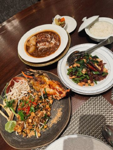 點了一些非常受歡迎的泰國菜,一共吃了至少12道菜,從泰式米粉、冬陰功湯,綠咖喱到芒果糯米飯,所有菜餚的一個共同特點是味道醇厚。廚師們能夠做出恰好的味道,而不至於過鹹、辣或酸。服務也非常周到,很注意細節。