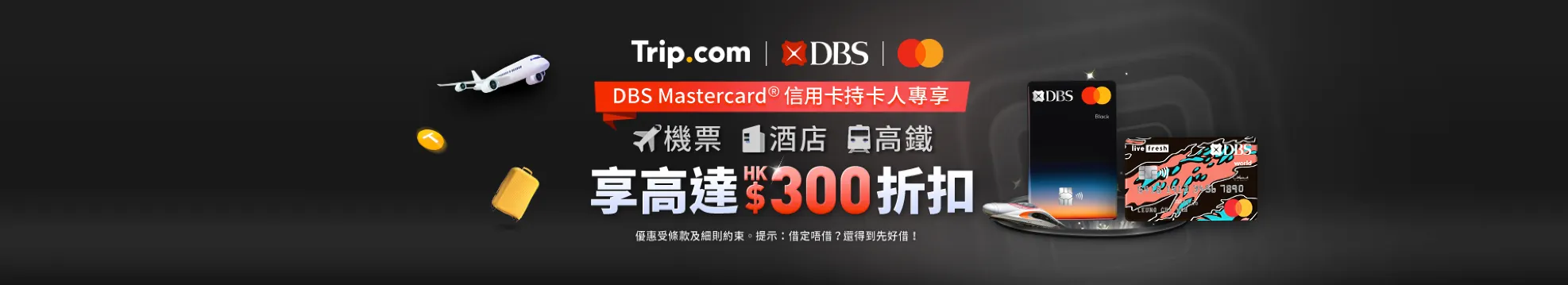 立即參與 DBS Mastercard® 信用卡旅遊優惠享受假期!2025年12月16日至2026年2月16日,憑 DBS Mastercard® 信用卡於 Trip.com 預訂機票、酒店及高鐵車票,輸入指定優惠代碼即享以下優惠!折扣優惠數量有限,先用先得。