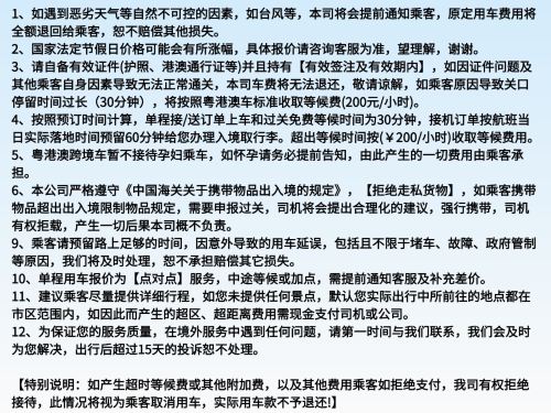 2.溫馨提示【上車或過關時,司機免費等候30分鐘,逾時將按每小時收取200元等候費】