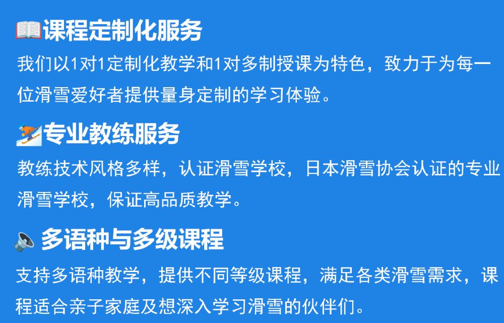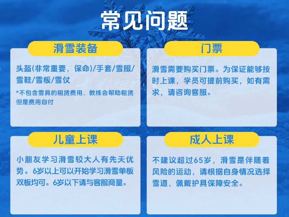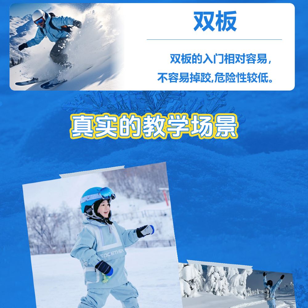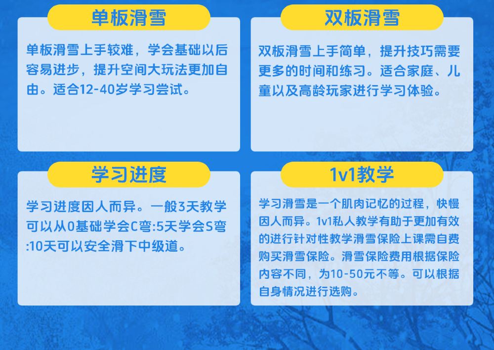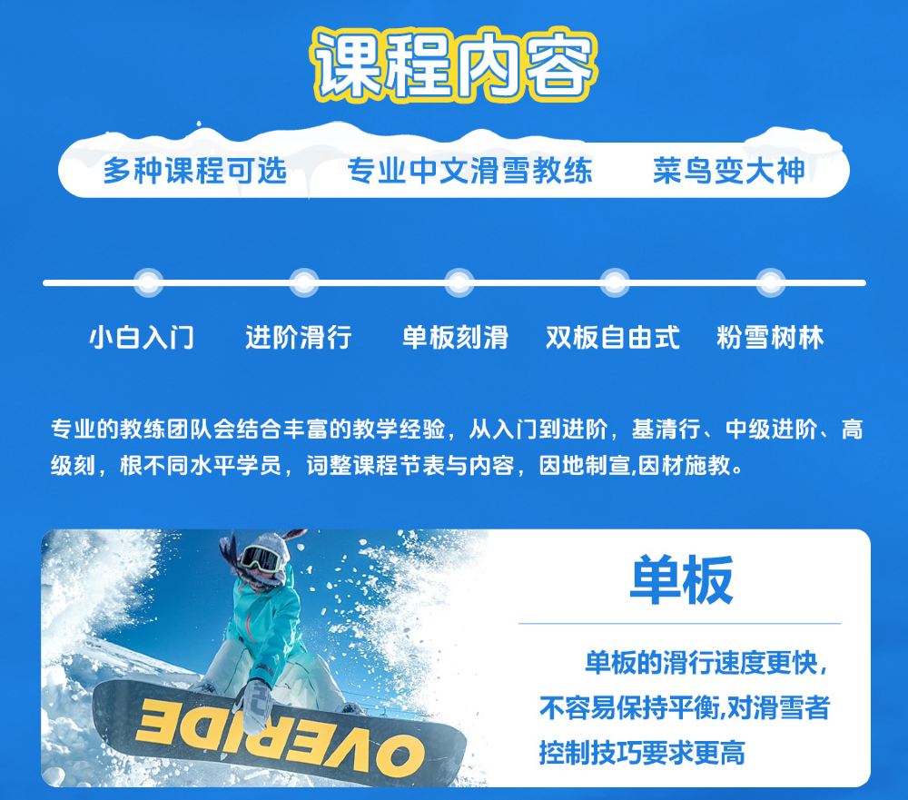 年齡不得低於5歲;7歲以下兒童及60歲以上成人,需報名一對一雙板課程;特殊情況經教練同意,成人與兒童並班上課,教學將以兒童為主。
