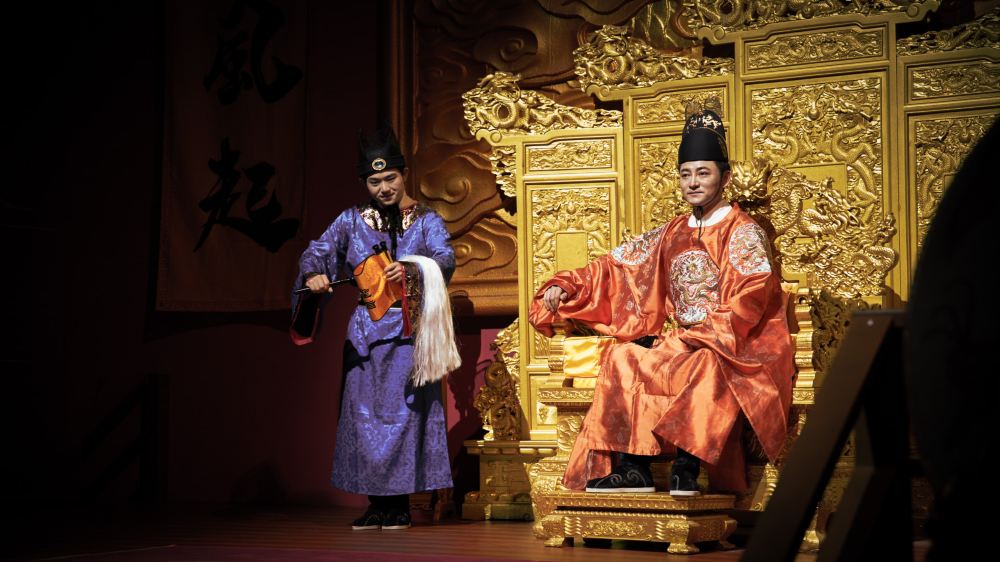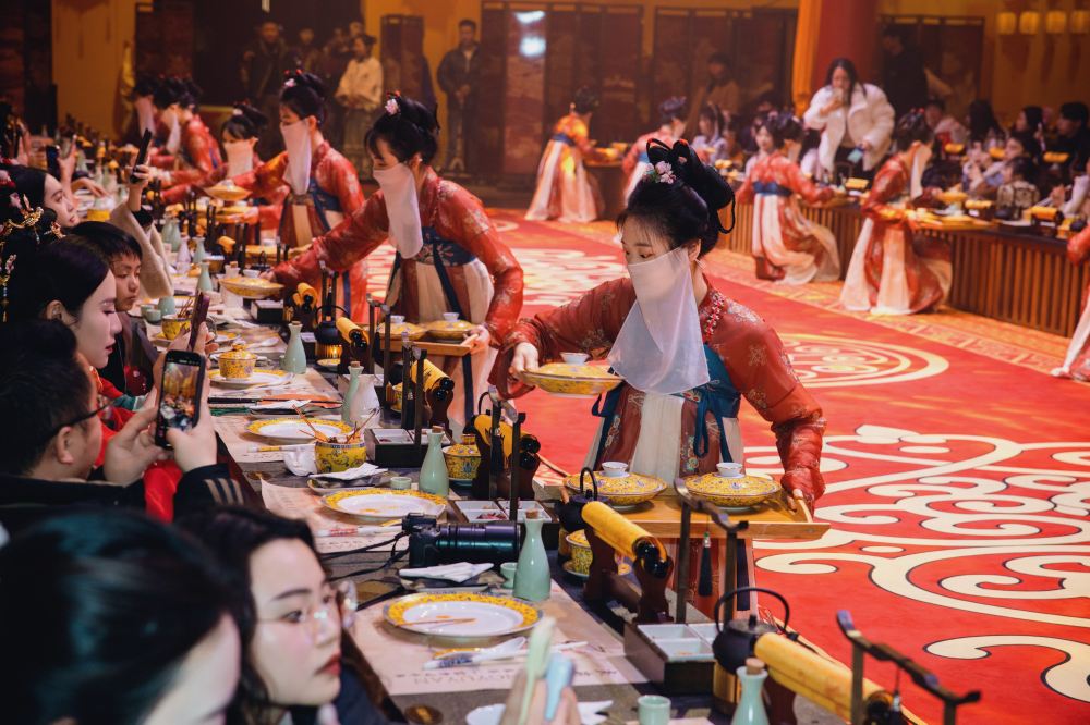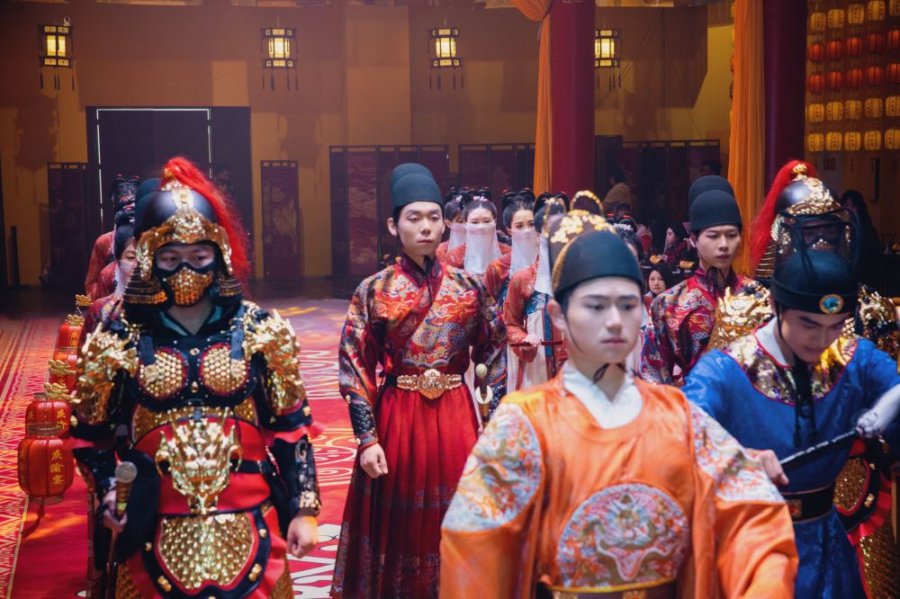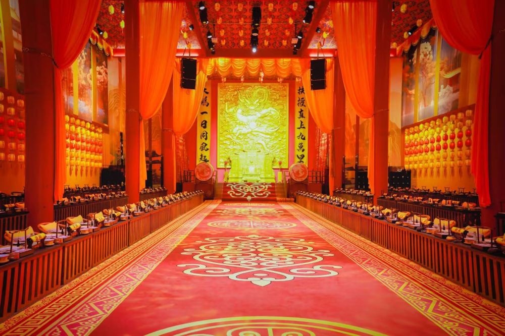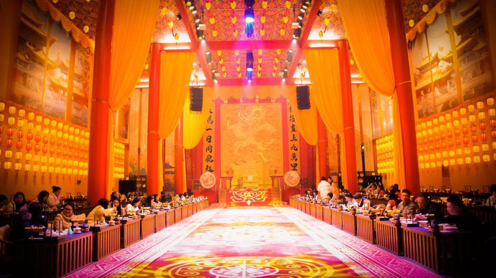 帝王主題表演更將宮廷氛圍推向高潮:開席後約20分鐘,身穿明黃色龍袍的「帝王」演員將在御林軍儀仗隊護送下登場,伴隨《朝天子》古樂緩步走上主舞台,手持玉圭行「祭食禮」,口中吟誦「萬方食事,以民為天」的祝詞,莊重儀式感瞬間拉滿