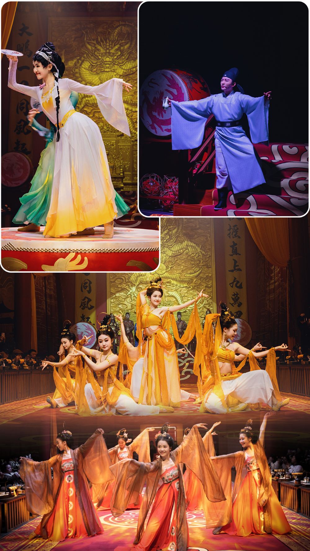 * 每一位演員都以超級專業的姿態,帶你領略各個時期的舞台表演劇,燈光、音效與舞美完美融合,營造出一場視聽的豪華盛宴。每一個表演結束,便會呈上一道佳餚,表演與美食交替進行,一邊享受表演一邊進餐,彷彿自己就是古代的君王,享受著至高無上的待遇,讓你沉浸在歷史的韻味中。