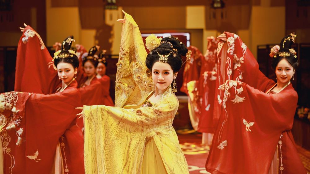 《萬國來朝》舞姬身著華服,伴隨編鐘、古箏奏響的古樂翩躚入場,拱手行禮間拉開筵席序幕