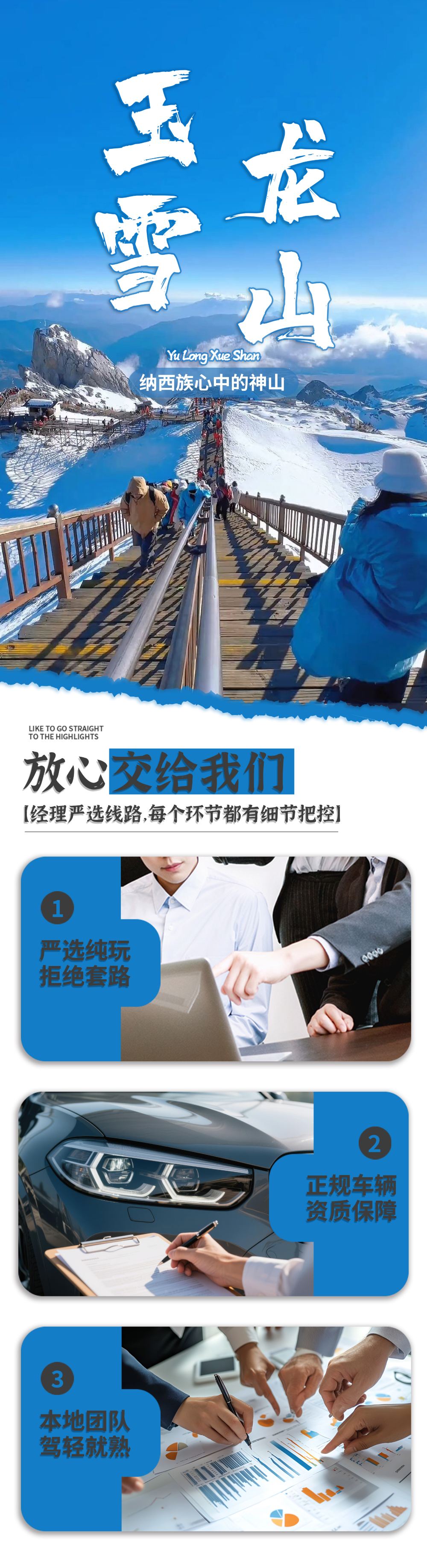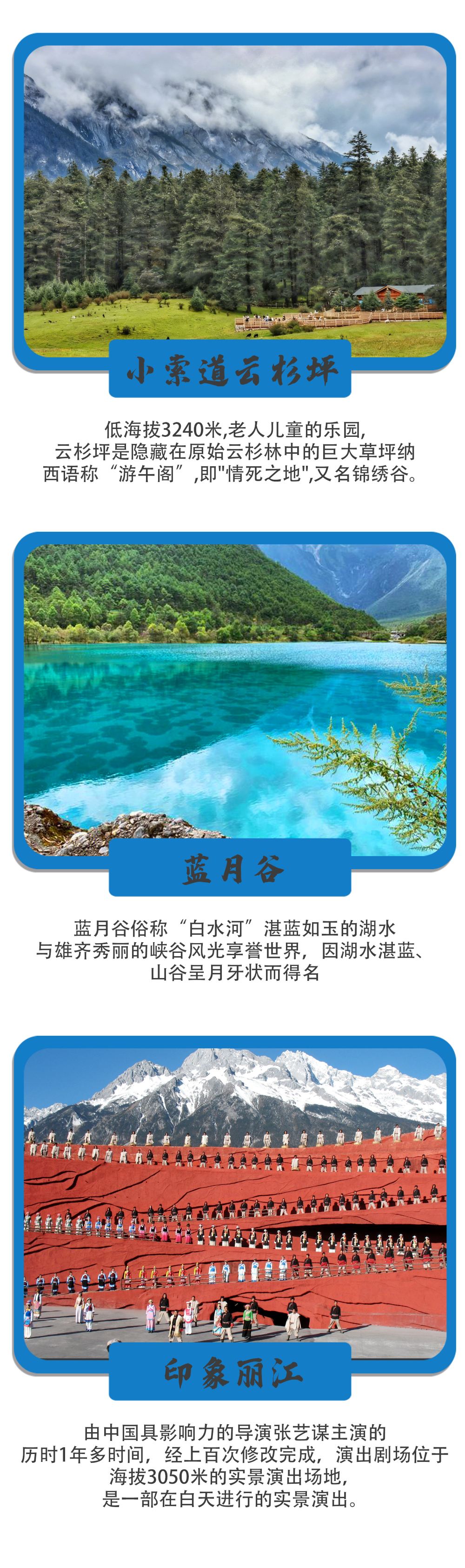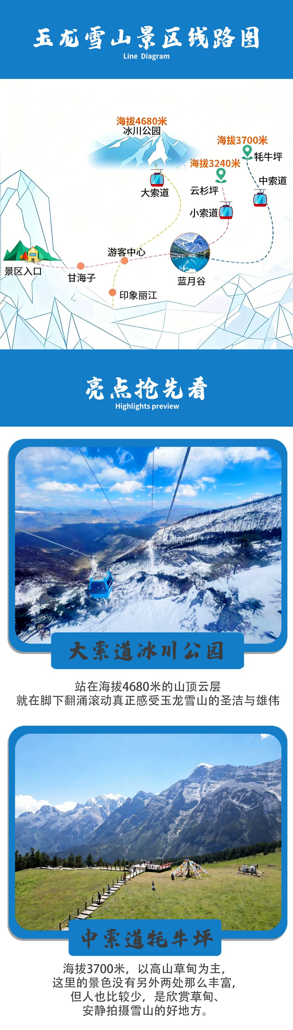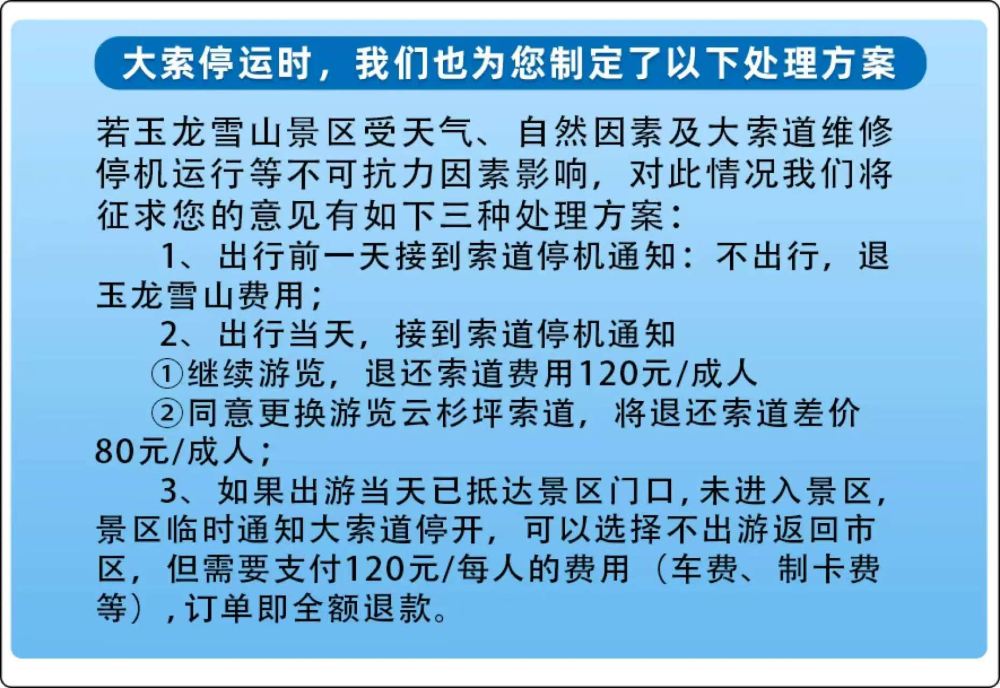 2.由於玉龍雪山景區處於高海拔地區,如遇雨雪天氣,景區多霧能見度較低,可能會影響您的遊覽體驗,請遊客朋友知曉並在遊玩過程中注意腳下安全。