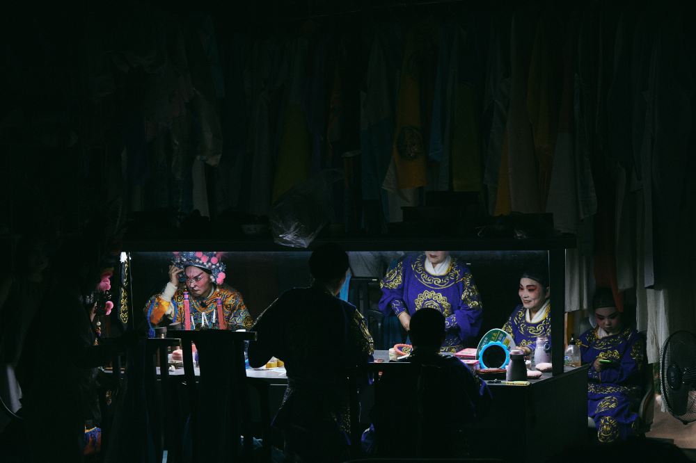 化妝間內,幾位演員正準備登場。燈光昏暗,掛滿戲服的背景營造出神秘的氛圍,幾位演員身穿帶有金色花紋的戲服,有的在調整頭飾,有的在整理妝容,鏡子映照出他們專注的神情,正為帷幕拉開前作最後的精心準備。