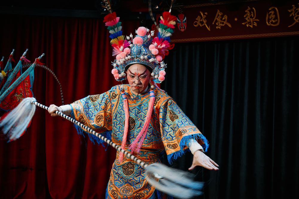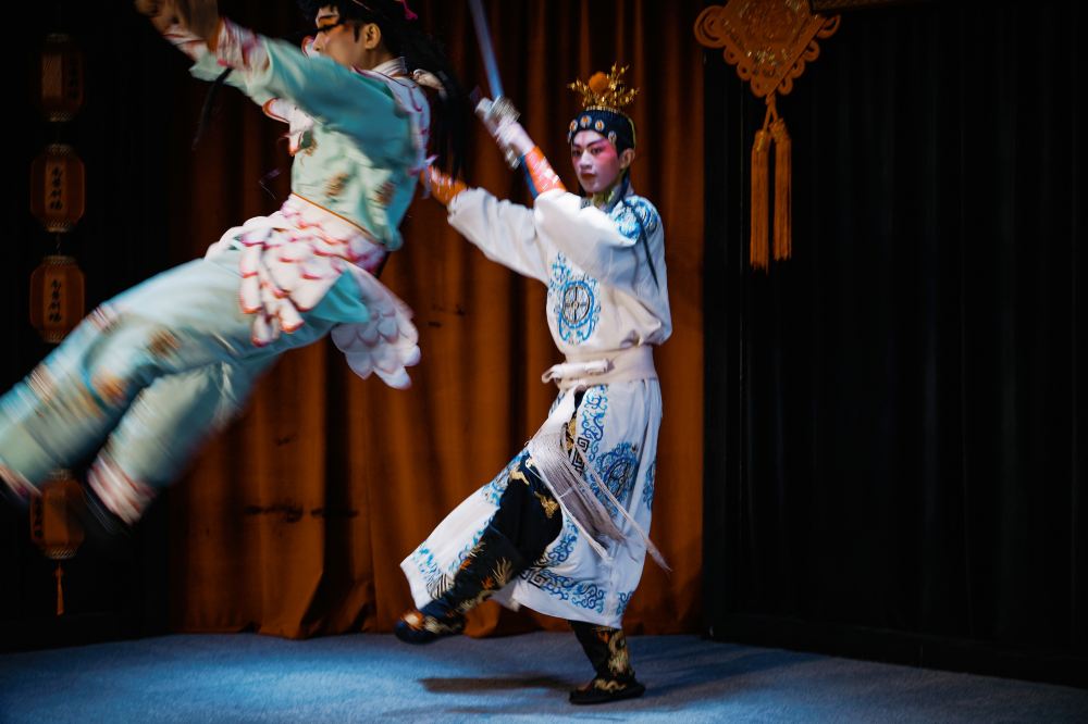 兩位演員正在表演武打戲份,背景的棕色幕布與左側的紅色燈籠,為這場打鬥增添了傳統戲曲的韻味,演員們的動作充滿力量與張力,沉浸式的表演將觀眾帶入到了刀光劍影的古代戰場