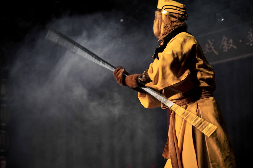 扮成孫悟空的演員手持金箍棒,身著黃色戲服,頭戴標誌性的緊箍咒頭冠。金箍棒在他手中飛速轉動,帶起一道道虛影,煙霧的朦朧感與演員的動態形成對比,彷彿讓齊天大聖從神話中走出,在舞台上再現降妖除魔的颯爽英姿