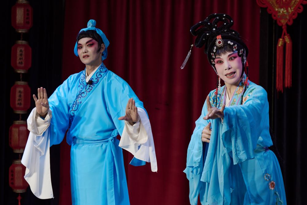 兩位演員身著藍調戲服表演。他們姿態優雅,動作協調,背景的紅色幕布與左側的紅色燈籠形成呼應,傳遞出傳統戲曲中才子佳人的浪漫韻味,一顰一笑都似在訴說著一段古典情緣。