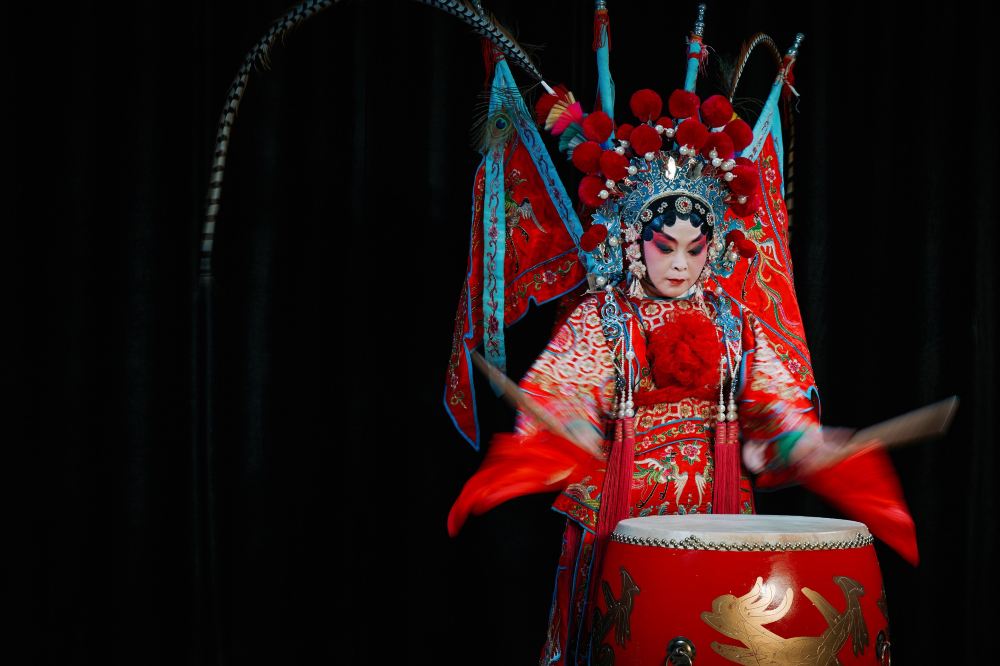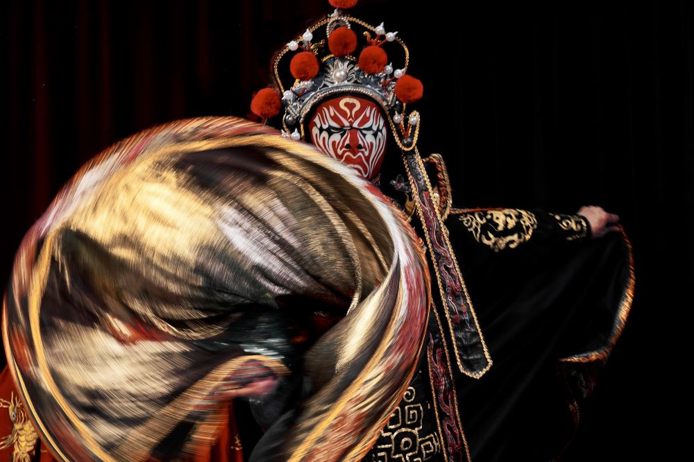 身着紅色武旦戲服的演員正在表演,戲服上繡滿了繁複的花紋,色彩艷麗且層次豐富。她共同營造出濃烈的戲曲氛圍,每一個動作都將武旦的英氣與柔美融合得恰到好處,彷彿在演繹一段沙場征戰的傳奇故事