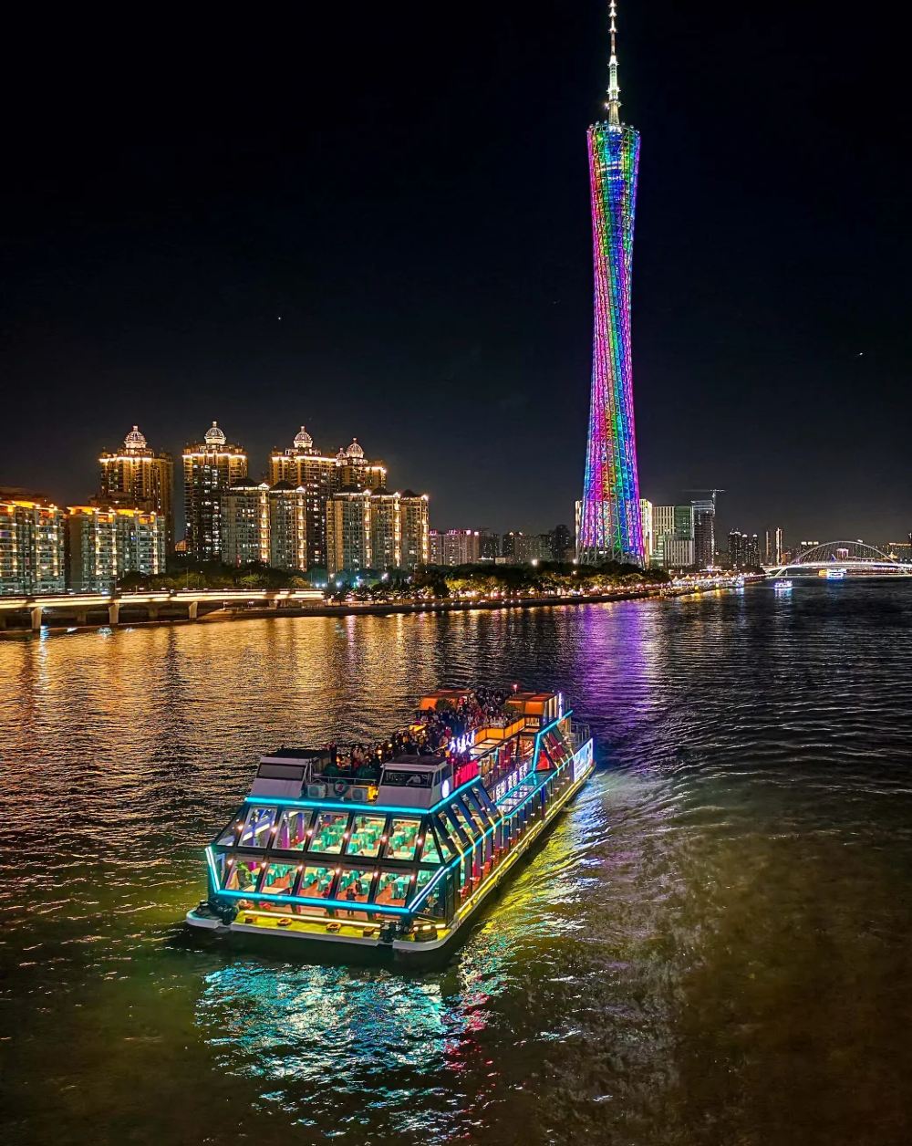 ▲ 登船後,你將在晚風與燈光中展開沉浸式夜遊之旅 —— 珠江如一條流光溢彩的綢帶,兩岸建築在燈光照耀下猶如「七色明珠」鑲嵌其中,匯聚成絢麗多彩的「珠江彩虹」